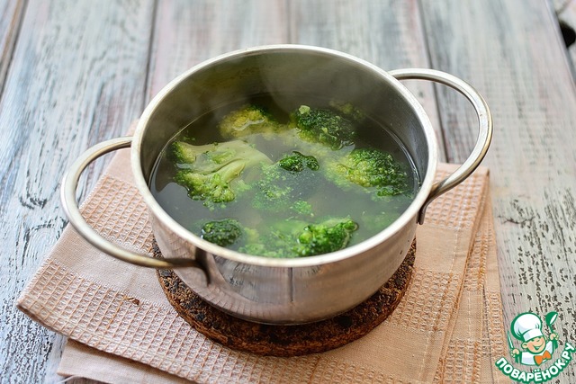 Брокколи залить водой, проварить 4 минуты после закипания.