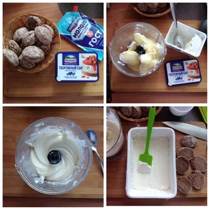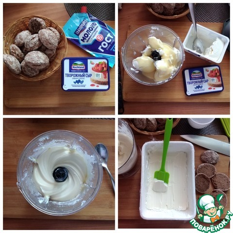 Время приготовления торта без выдержки его в холодильнике. Торт готовится очень быстро. Готовим все продукты. В чашу блендера выкладываем творожный сыр крем-чиз HOCHLAND. Добавляем сгущённое молоко и соединяем. Крем готов. Попробуйте на вкус и если что, то добавьте ещё сгущёнки. Так же его можно сделать послаще, если вы купили не очень сладкие пряники. Крем получается из этого сыра просто отличным! Форму берите любую, какая у вас есть. Моя форма прямоугольная со сторонами 15Х20 см. Застелите её пищевой плёнкой так, чтобы крАя было достаточно потом собранный торт накрыть сверху. Выложите на низ слой крема ~ 1 см. Это будет верх торта. Удобней работать силиконовой лопаткой.