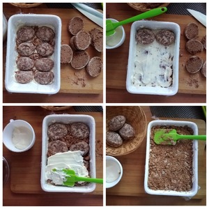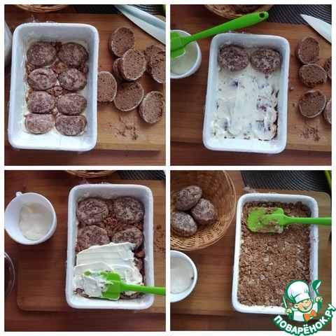 Пряники нужно разделить на 2 части вдоль. Если у вас крупные пряники, то можно - на 3 части. На слой крема выкладываем слой пряников срезом вниз. Если у вас в форму не поместится ровное количество половинок, то подрежьте их, чтобы поместились и этими срезками заполните пустые места. Из общего количества крема нужно выложить пару ложек. Это для того, чтобы потом обмазать ещё торт сверху и с боков. Промазываем первый слой пряников и выкладываем на крем второй слой половинок. Опять промазываем. Два пряника измельчаем в крошку и присыпаем ей крем слоем ~ 1 см. Утрамбовываем слой, чтобы не просвечивал крем. Подворачиваем края плёнки.