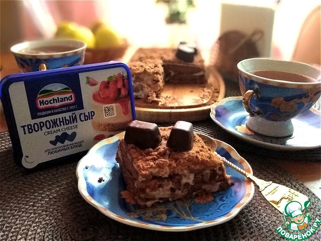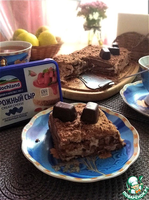 Торт без выпечки из трёх ингредиентов. Справится любой начинающий поварёнок, а результат отличный. Нам понадобятся шоколадные пряники, творожный сыр крем-чиз HOCHLAND и сгущённое молоко, а украсить торт можно по разному, можно и не украшать. Такой торт можно подать не только к чаю домашним, можно и угостить гостей. Делается очень быстро, только ему нужно постоять в холодильнике минимум 3 часа.