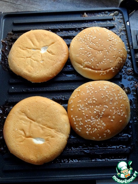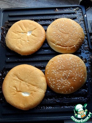 На этом же гриле (сковороде) прогреть булочки, разделив их на две части.