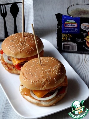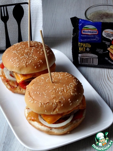 Сырная новинка от Хохланд отлично подошла для моего чизбургера. В этом рецепте, я отошла от привычного сочетания. А именно, заменила всевозможные овощи домашним лечо. В связи с этим, не пришлось готовить отдельно соус. Слегка островатый перец с томатно-чесночным соусом шикарно "сошлись" с мясной котлетой и толстыми ломтиками "гриль чиз", для большей пикантности можно добавить и несколько колечек репчатого лука. Такой бургер выручит в зимнее время года, когда овощи в магазине, больше напоминают траву)).