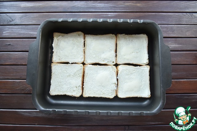 Каждый ломтик хлеба мазать сливочным маслом и выложить первую партию хлеба на противень.