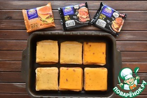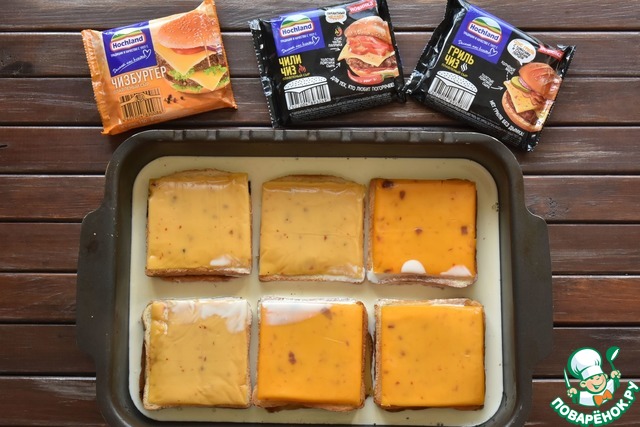 На три следующих тоста выложить ломтики плавленного сыра Hochland Чизбургер. Сверху на сыр положить поджаренные оставшиеся тосты и накрыть ломтиками плавленного сыра Hochland гриль чиз. -