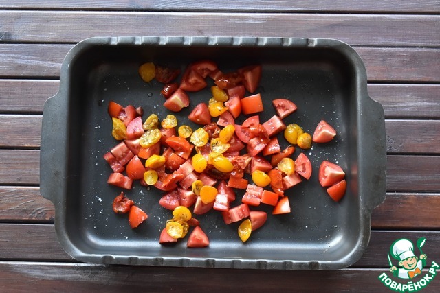 Помидоры нарезать кубиком среднего размера, посыпать их щепоткой соли. Добавить к ним горсть вяленых томатов и поставить противень в духовку под гриль на 3 минуты. Переложить томаты с противня в миску.