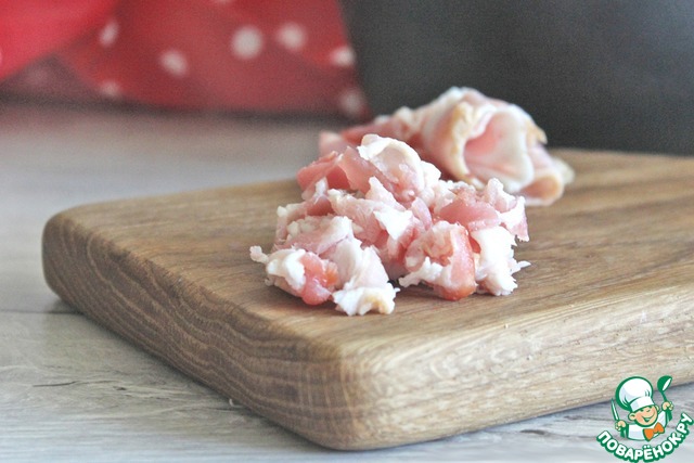В казане растопить сливочное масло, в котором обжарить около 5 минут кусочки бекона.