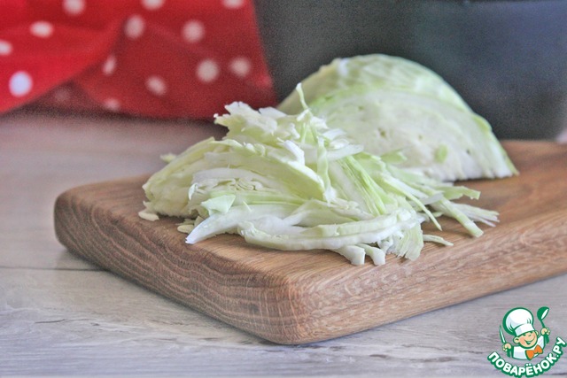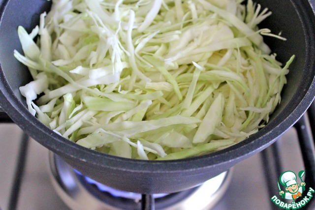 Затем добавить нарезанную тонкой соломкой капусту, перемешать и тушить до мягкости около 10 минут, постоянно помешивая.