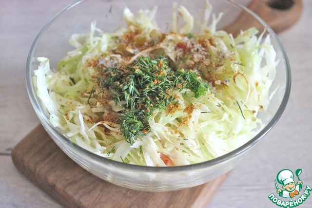 Тушеную капусту с беконом выложить в чашку, немного остудить. Посолить и приправить по вкусу, добавить мелко нарезанную зелень укропа.