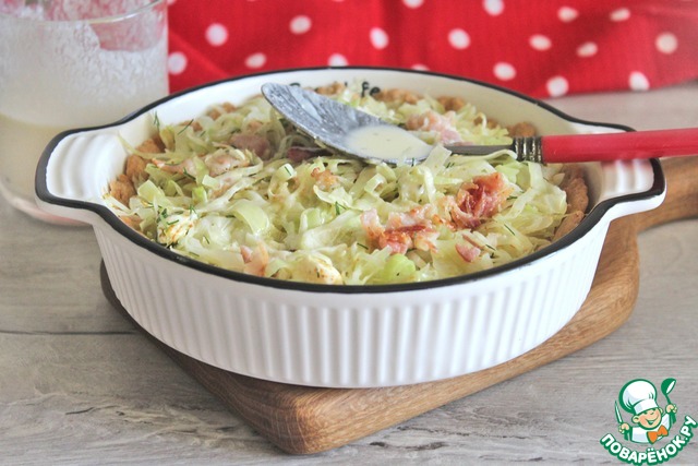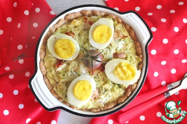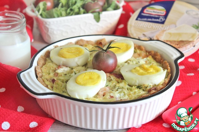 Предлагаю вашему вниманию рецепт яркого, вкусного и сытного киша, который подойдет и для встречи гостей, и для сытного ужина. Тонкая нежная основа отлично удерживает начинку из капусты, бекона, зелени и сливочного плавленого сыра в сметанной заливке, а половинки яиц придают кишу изюминку. Готовить несложно, а равнодушным он не оставит никого, он обязательно станет частым гостем на вашем столе, особенно осенью.