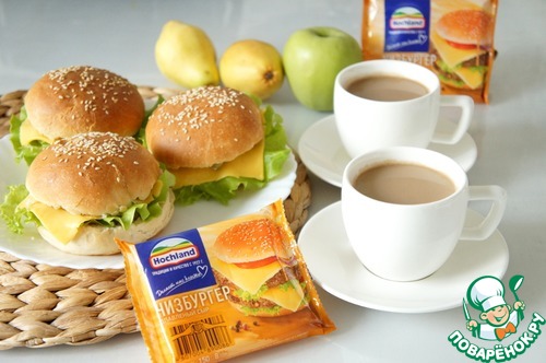 На одну половинку кладём лист салата, на другую ломтик плавленного сыра Чизбургер от Хохланд. Соединяем половинки в сэндвич.