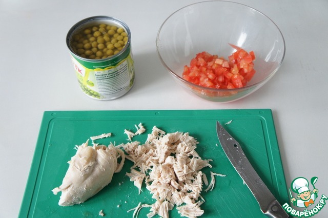 Мелко режем куриную грудку, помидор. Добавляем горошек. Заправляем майонезом, у меня адыгейский: ароматный со специями. Соль и перец по вкусу.