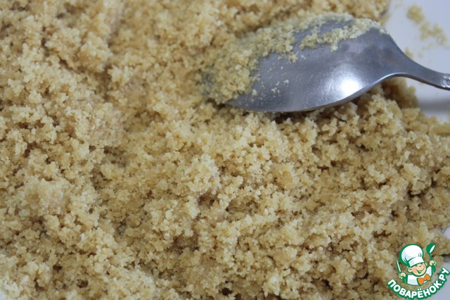 На дно высыпать масляную крошку, разровнять и утрамбовать.