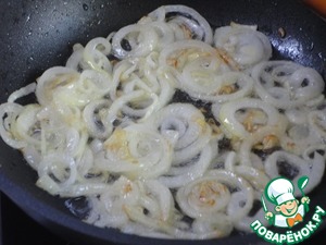 Лук нарезать тонкими кольцами и обжарить в 2 ст. л. масла вместе с рубленым чесноком.