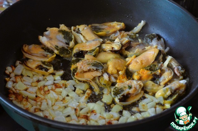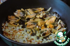Добавить половинки мидий, жарить пару минут. -