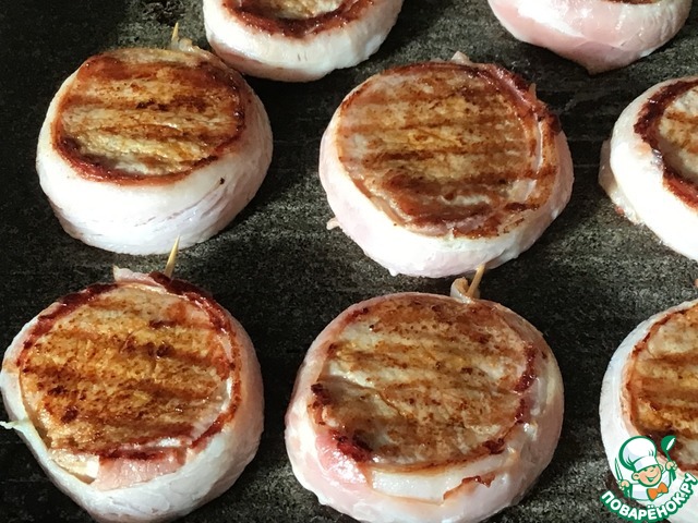 Каждый медальон обернуть полоской бекона и закрепить зубочисткой.