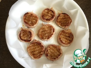 • Каждый медальон обернуть полоской бекона и закрепить зубочисткой.