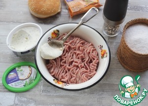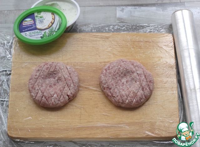 Приготовить фарш, добавить ложку творожного сыра с зеленью ТМ Hochland, посолить, поперчить, хорошо отбить.
