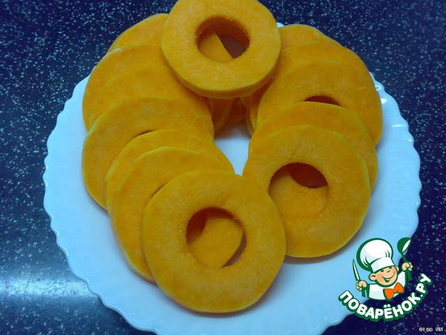 Очистила тыкву и нарезала кружочками 0,5-0,7 см толщиной.