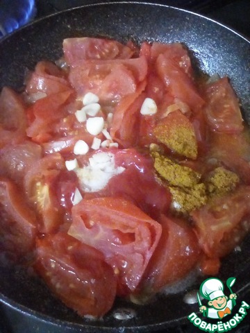 Открыть крышку. В сковородку добавить чеснок, зиру, соль, перец, томатную пасту. Влить немного воды (1/4 стакана).