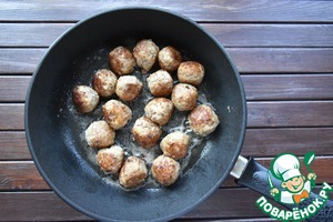На сковороде разогреть 2 ст. л. оливкового масла, выложить готовые фрикадельки в один слой и обжарить их со всех сторон до румяности.