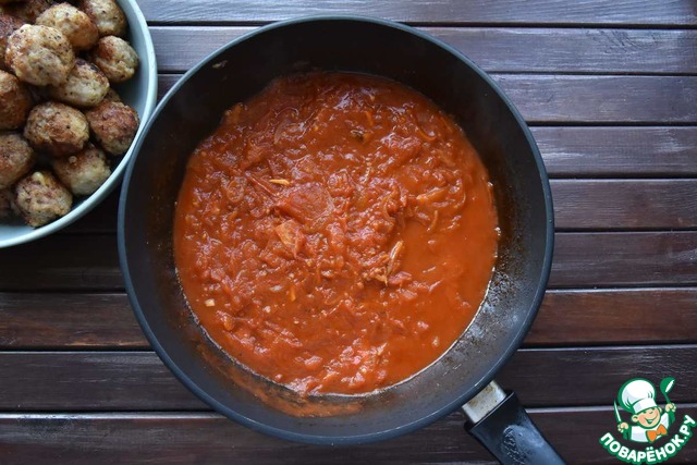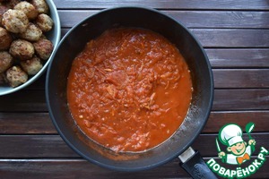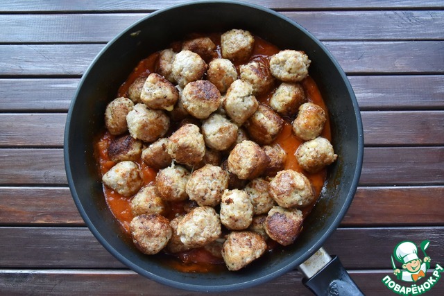 В соус выложить подготовленные фрикадельки и потомить их в соусе еще минут 10, чтобы вкус и аромат соуса проник в фрикадельки и сыр внутри них расплавился.