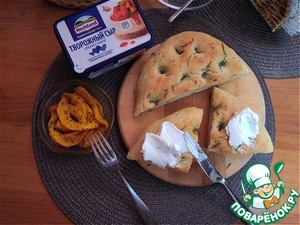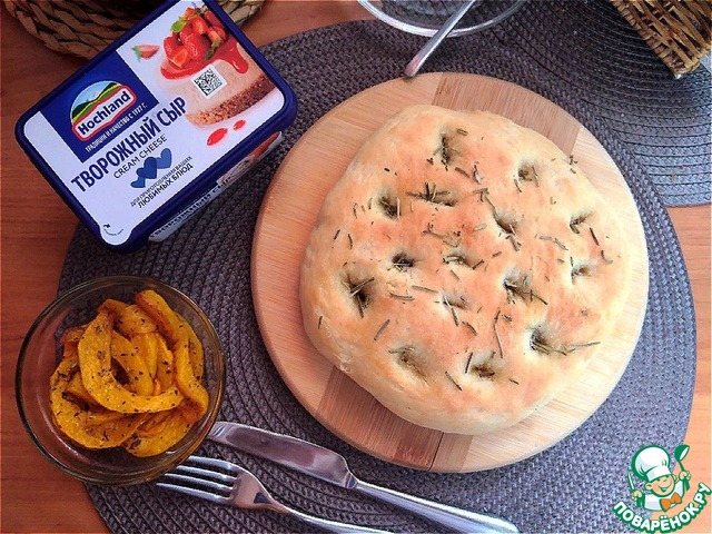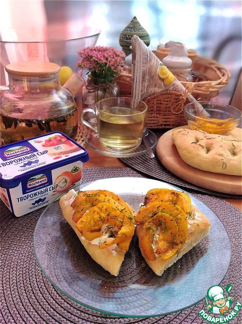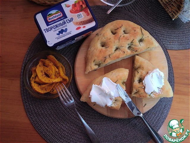 Фокачча - пшеничная лепёшка, которую готовят из различных видов теста - либо дрожжевого, которое является основой для пиццы, либо пресного сдобного. (Википедия) Такая лепёшка вкусна сама по себе, а если намазать её ещё и творожным сыром HOCHLAND крем-чиз - это объеденье. А если ещё запечь кусочки тыквы с итальянскими травами да с оливковым маслом и поместить их поверх сыра - безумное объеденье!