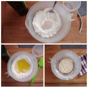 Фокаччу выпекаем заранее, чтобы она уже была готова для бутербродов. В посуду выкладываем пшеничную муку, добавляем сахар, соль и быстродействующие дрожжи. Перемешиваем. Делаем углубление и наливаем в него тёплую воду и оливковое масло. Лопаточкой начинаем замешивать тесто, затем работаем руками. Тесто скатываем в шар и ставим в тёплое место на 30 минут, накрыв полотенцем посуду. Я грею всегда духовку до т-50 С.