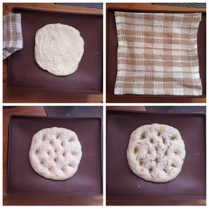Берём то, на чём будем выпекать фокаччу. Я взяла силиконовый коврик. Тесто поднялось, обминаем его хорошенько руками и формируем лепёшку тоже руками. Выкладываем на коврик и немного растягиваем края ладонями. Накрываем полотенцем и ставим ещё на 15 минут в тёплое место. Раскрываем. Лепёшка поднялась. Большим пальцем делаем углубления по всей поверхности. Поливаем оливковым маслом, присыпаем розмарином и солью. Ставим в разогретую духовку до т-250 С на 15 минут. Фокачча выпекается при максимальной температуре как и пицца. У меня т-250 С максимальная в духовке. Ориентируйтесь на свою духовку. Фоккача готова. Такая лепёшка может храниться до 3 дней, если её завернуть в х/б или холщовую салфетку.