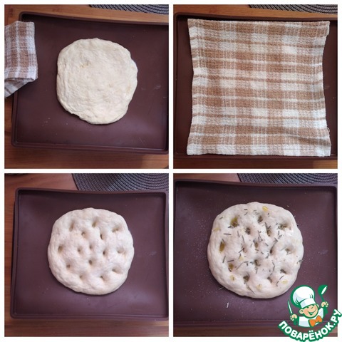 • Берём то, на чём будем выпекать фокаччу. Я взяла силиконовый коврик. Тесто поднялось, обминаем его хорошенько руками и формируем лепёшку тоже руками. Выкладываем на коврик и немного растягиваем края ладонями. Накрываем полотенцем и ставим ещё на 15 минут в тёплое место. Раскрываем. Лепёшка поднялась. Большим пальцем делаем углубления по всей поверхности. Поливаем оливковым маслом, присыпаем розмарином и солью. Ставим в разогретую духовку до т-250 С на 15 минут. Фокачча выпекается при максимальной температуре как и пицца. У меня т-250 С максимальная в духовке. Ориентируйтесь на свою духовку. Фоккача готова. Такая лепёшка может храниться до 3 дней, если её завернуть в х/б или холщовую салфетку.