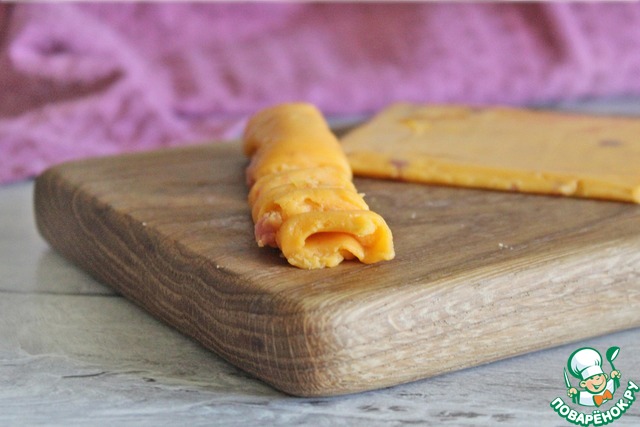 Нарезать скрученный рулетиком сыр на кусочки шириной около 3-5 мм.
