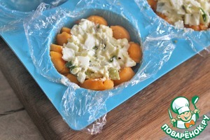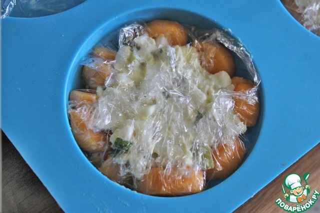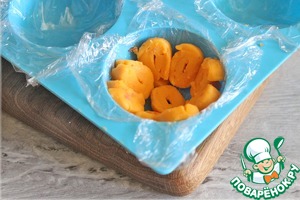 Силиконовую форму в виде полусферы выслать пищевой пленкой, выложить нарезанными кусочками сыра.