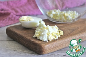 Приготовить яичную начинку для закуски. Для этого яйца мелко порезать, сложить в чашку.