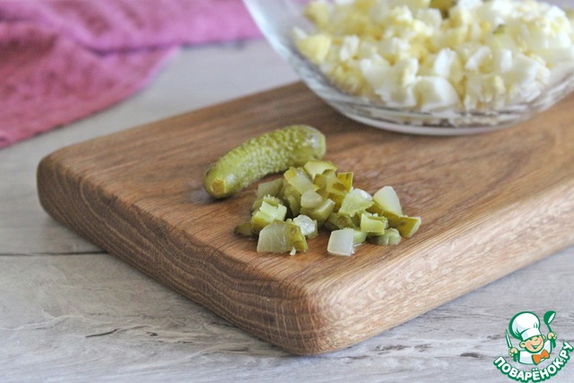 Маринованные огурчики мелко порезать, добавить в чашку к яйцам.