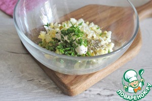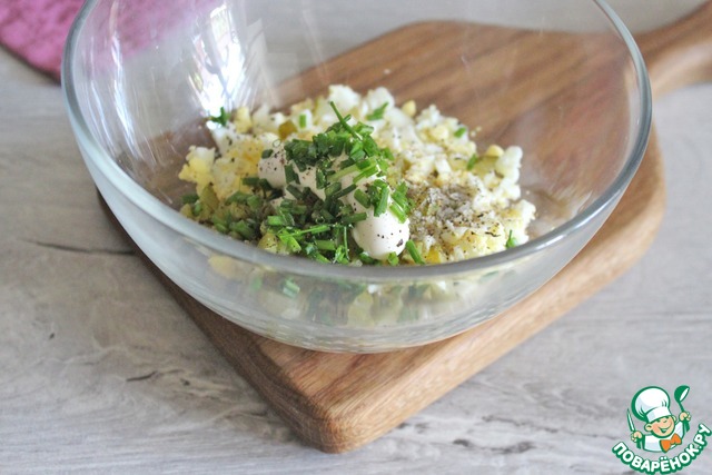 Затем добавить майонез, мелко порезанный зеленый лук, посолить и поперчить по вкусу, перемешать. Начинка готова.