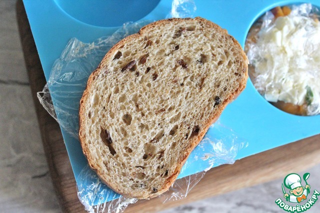 Перед подачей пищевую пленку развернуть, положить ломтик хлеба.
