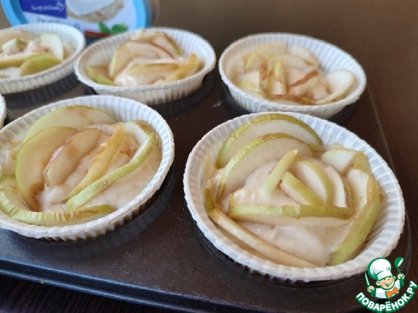 Яблоко нарезаем тонкими ломтиками и вставляем сверху. Можно порезать кубиками и добавить просто во внутрь.