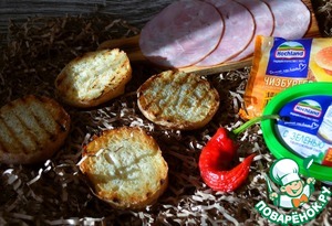 Булочки разрезать пополам, подсушить на сухой гриль-сковороде.