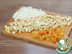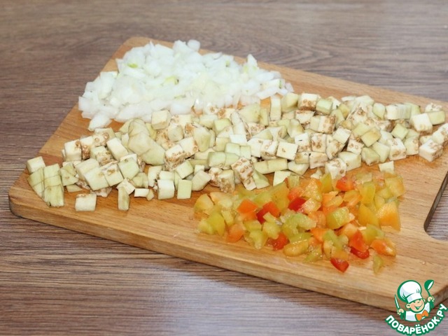 2. Приготовим начинку. Овощи: лук, баклажан, помидор и сладкий перец очищаем и нарезаем мелким кубиком.