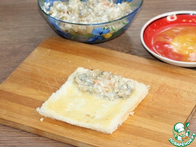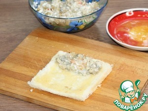12. На край ломтика хлеба, кладем 2 ст. л. начинки.