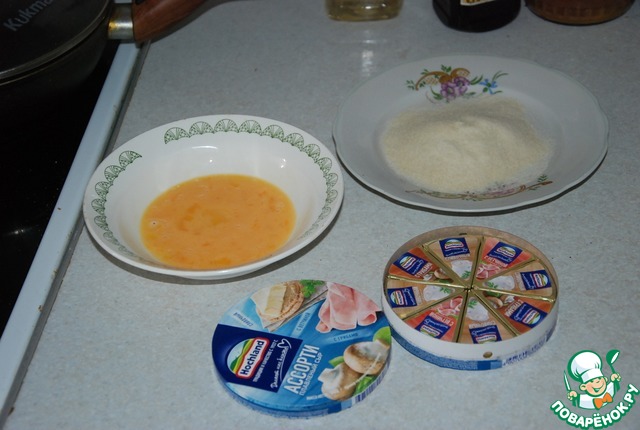 Рецепт из серии: быстрее готовить, чем писать. Поставим сковородку, смазанную растительным маслом, на огонь. В одну тарелочку высыпаем панировочные сухари, в другую разбалтываем яйцо, очищаем сырки от упаковки.