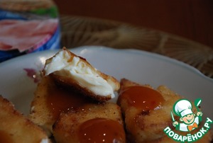 Готово. Подавайте с кисло-сладким соусом. Тягучий сливочный сыр в хрустящей корочке.
