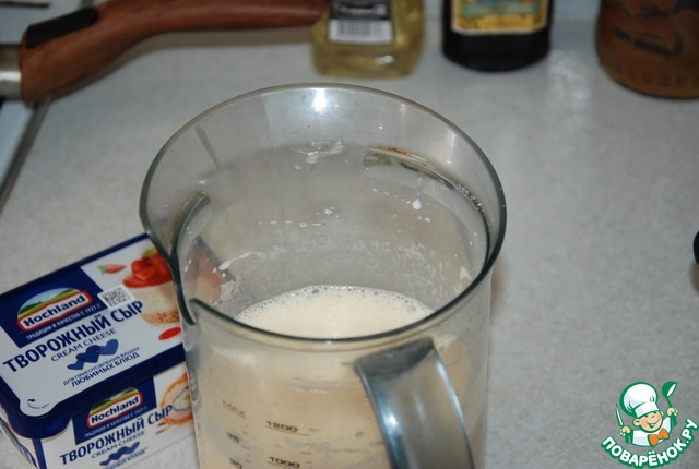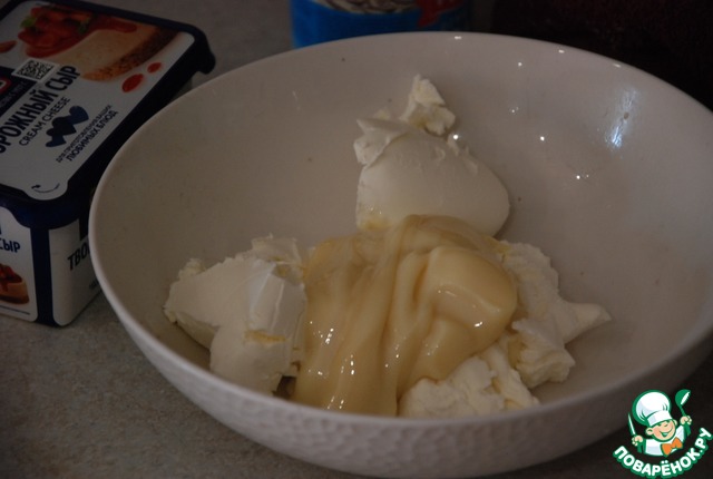 Творожного сыра не была, был мягкий творог, с ним сгущёнку и перемешала.