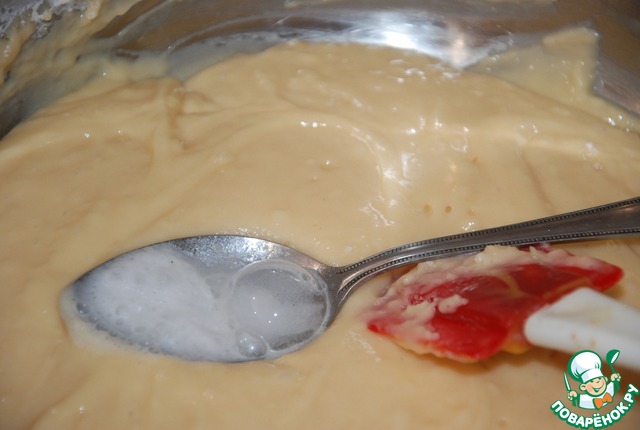 Насыпьте в столовую ложки соду и погасите ее уксусом. Вмешайте ее в тесто. Тесто больше перемешивать нельзя. Выложите тесто в форму.