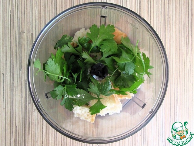 В чашу блендера выложите поломанный на кусочки хлеб и петрушку. Измельчите.