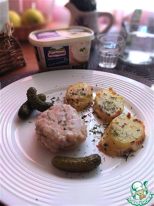 Подаём к мясу, рыбе... Я сделала котлеты. Выложила на 1 порцию по 3 сэндвича, котлету мясную, присыпала мелко рубленным укропом и дополнила острыми корнишонами.