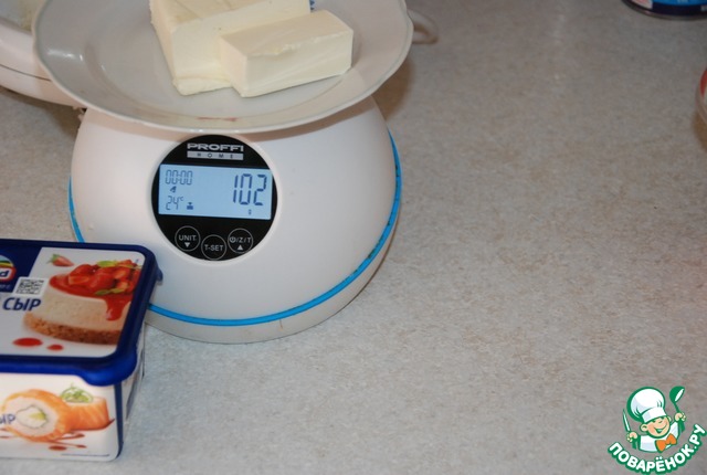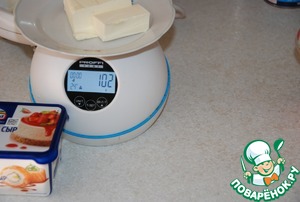 Выложить для размягчения 100 гр. сливочного масла и сыр. Он нам нужен комнатной температуры.
