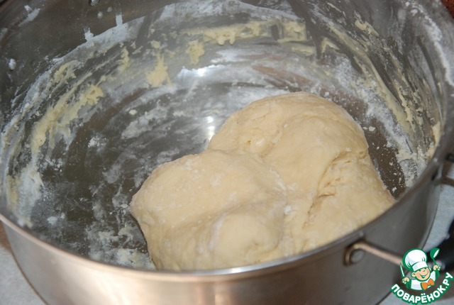 Готовим тесто. Смешать яйца с сахаром. Добавить сметану, все перемешать. Добавить муку, крахмал и соду. При необходимости добавьте немного муки. Перемешать все до однородной массы. Тесто липковатое. Убрать его в холодильник в пакете.
