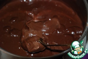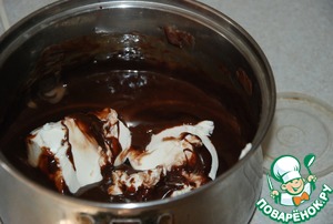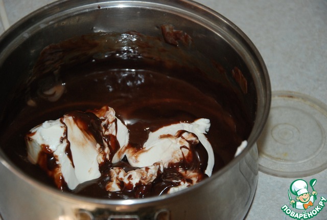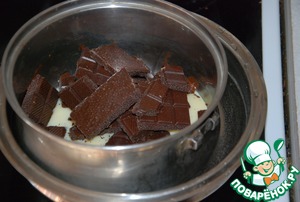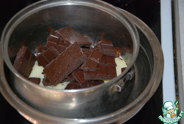 В миску с горячей водой ставим на небольшой огонь миску меньшего диаметра. Выкладываем в нее сгущенку и ломаем шоколад. Где-то через 1-2 минуты нужно все это размешать до эластичной блестящей массы.