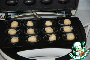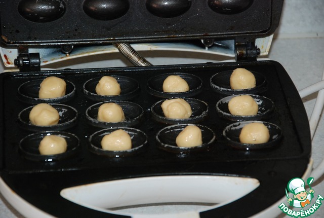 В разогретую орешницу в каждую выемку в серединку кладем шарик теста. Орешницу закрываем.