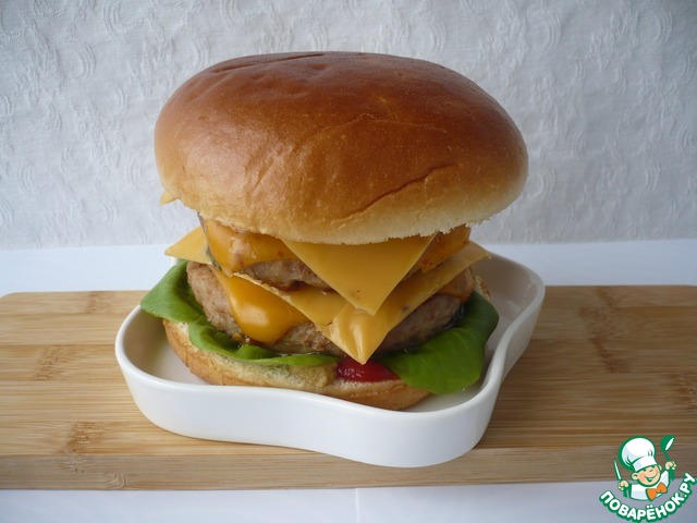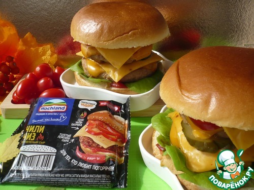 Пикантный чизбургер с двумя сочными котлетами и жаренным луком, а еще с двумя ломтиками плавленого сыра Чили Чиз ТМ "Хохланд", с добавлением соленых огурчиков и колец красного маринованного халапенью, заправленных горчицей и томатным соусом. Предлагаю попробовать приготовить его самостоятельно - вкусно, ароматно, сочно! Угощайтесь!